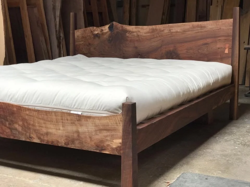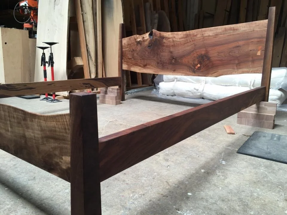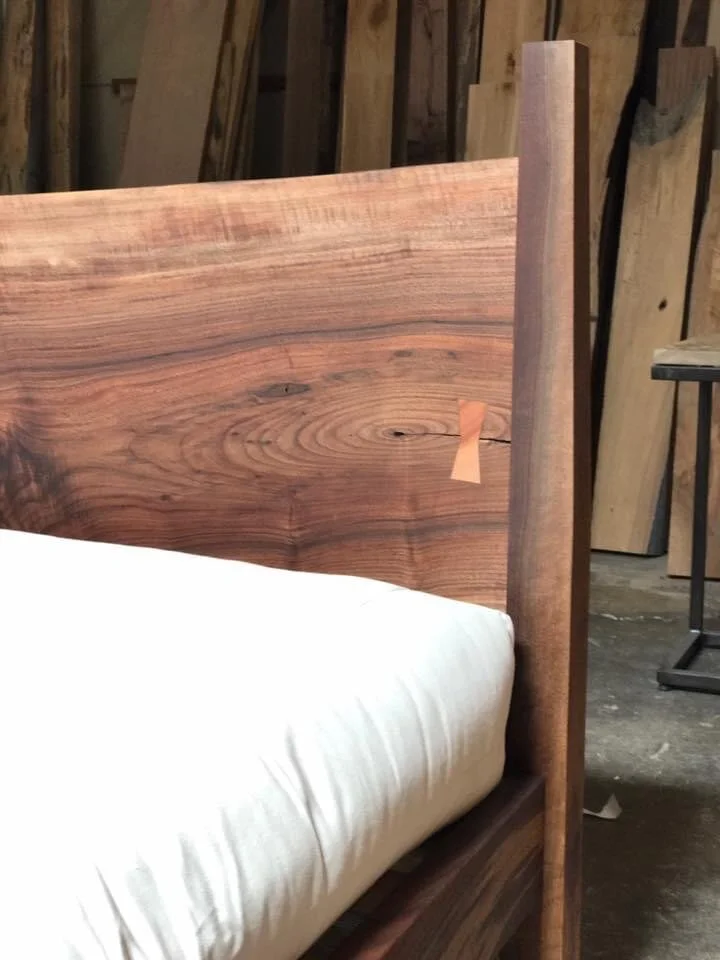 This Cal King custom frame is crafted entirely from Willamette Valley Orchard Walnut. The live edge headboard brings a natural feel while the tapered legs incorporate a more modern aesthetic. This bed would be suited for any style of home.